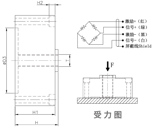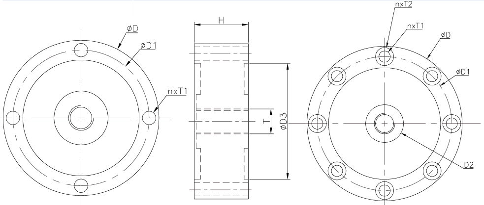 | 量程(KN) 尺寸(mm) | D | D1 | D2 | D3 | H | H1 | H2 | T | n×T1 | n×T2 |
