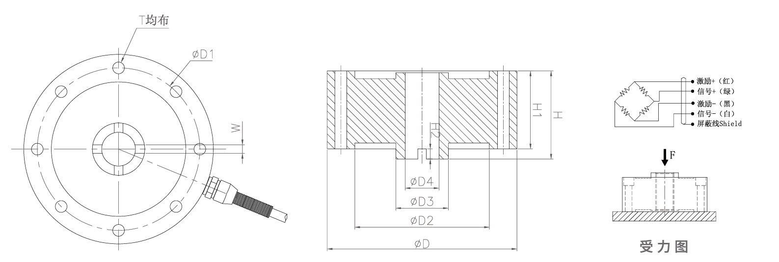 | 量程(KN) 尺寸(mm) | D | D1 | D2 | D3 | ØD4 | H | H1 | H2 | W | T |