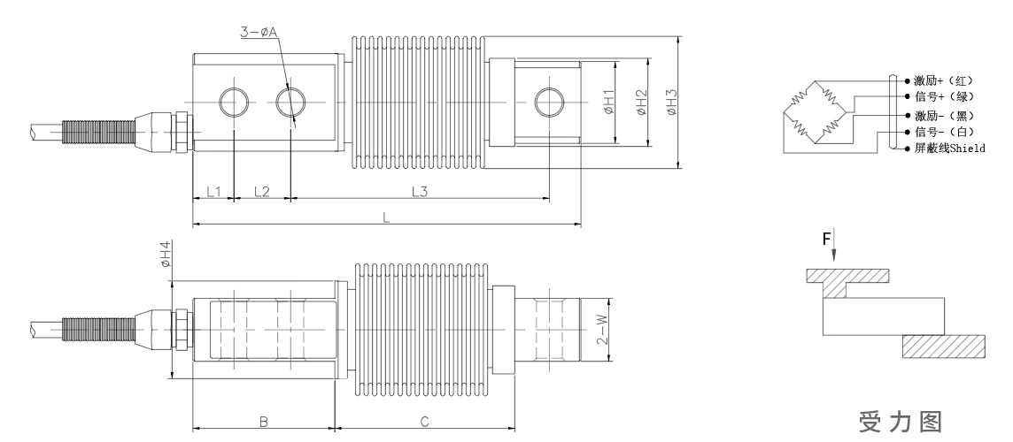 | 量程t/尺寸mm | L(mm) | L1(mm) | L2(mm) | L3(mm) | ØA | ØH1(mm) | ØH2(mm) | ØH3(mm) | ØH3(mm) | W(mm) | B(mm) | C(mm) |